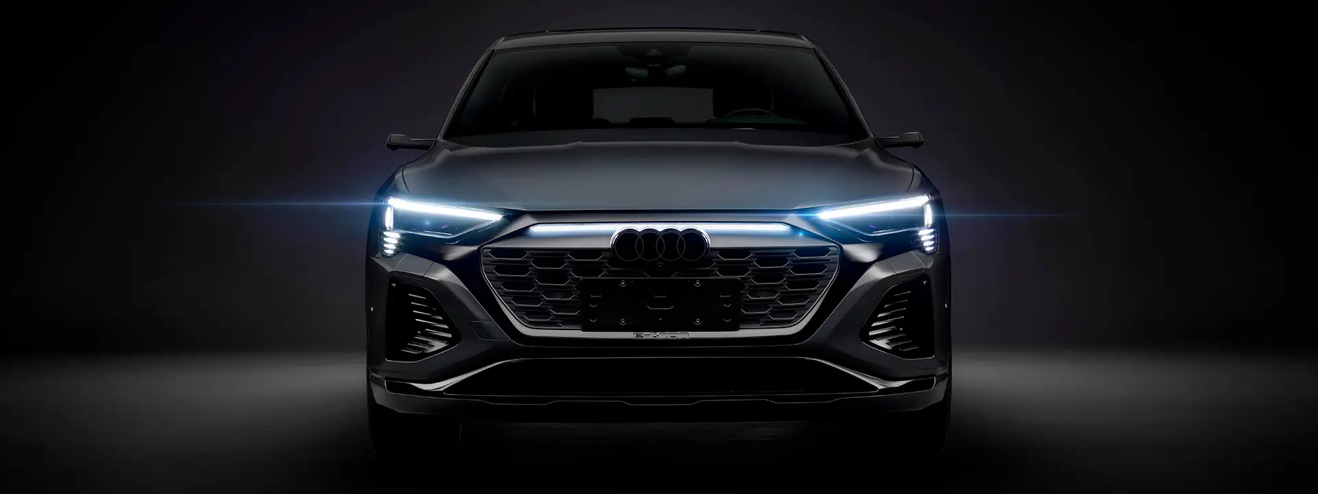 O Audi Q8 Sportback e-tron mostra o caminho a seguir para a mobilidade elétrica pioneira: com os detalhes progressivos da nova estratégia de emblemas da Audi, como, por exemplo, os anéis Audi em aparência 2D, um design frontal modificado e a nova grade Singleframe iluminada.