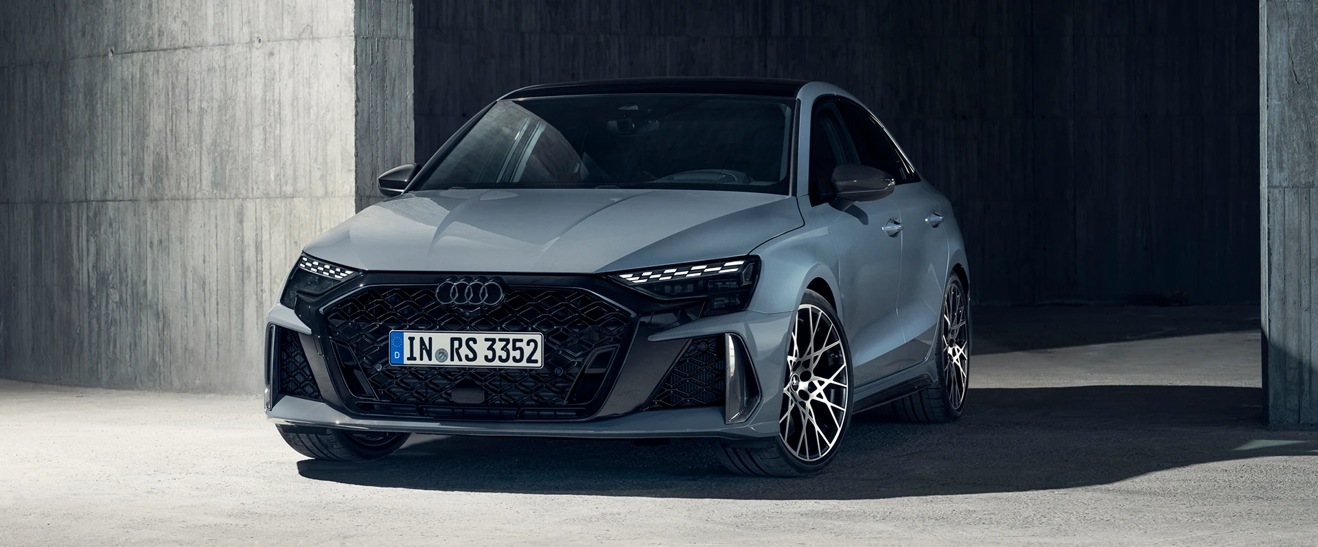 Proporções nítidas, elementos de design RS e detalhes expressivos. O novo Audi RS 3 Sedan fica ainda mais bonito na cor exclusiva RS Cinza Kemora Metálica.
