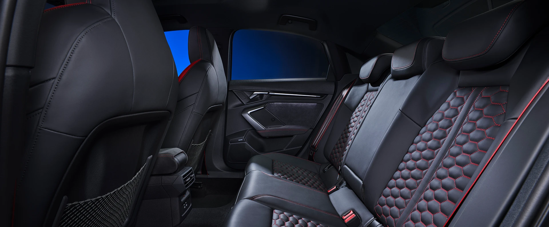 O interior é visivelmente esportivo com o pacote de design RS Vermelho, bancos dianteiros esportivos e volante esportivo achatado. A abordagem da dinâmica de condução também é claramente visível no Audi virtual cockpit plus com um design dos modelos RS selecionável.