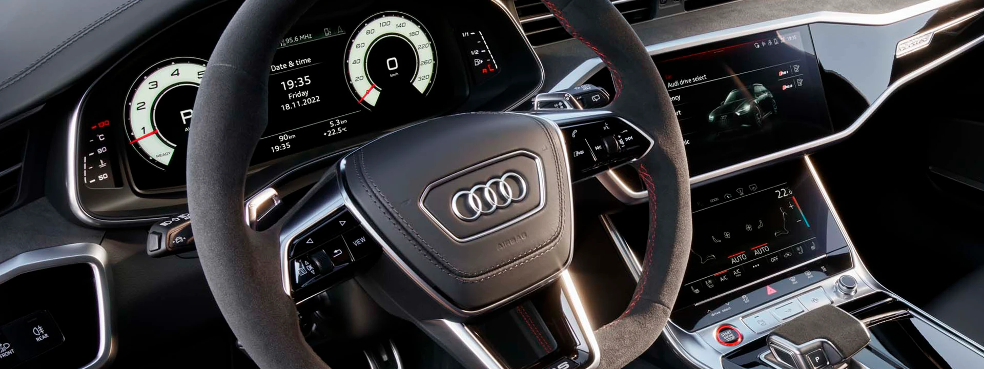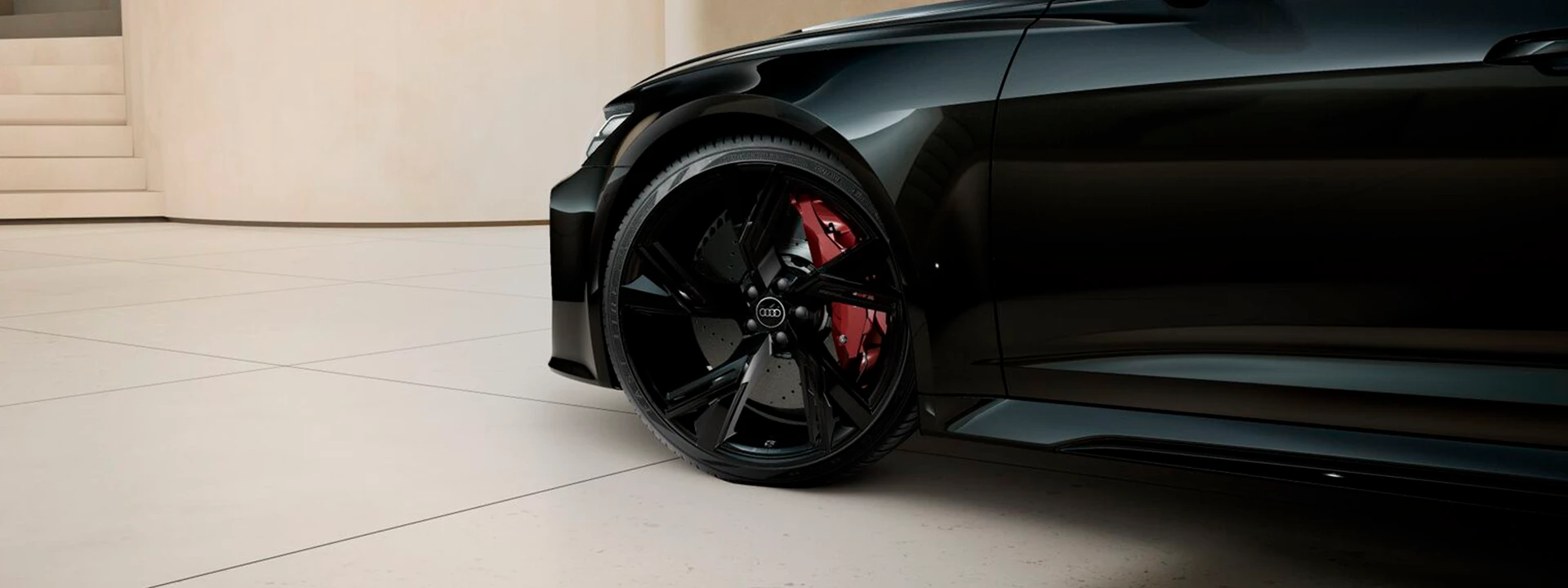 A versão mais potente do Audi RS 6 Avant possui design único com os detalhes visuais harmônicos em preto brilhante, combinando com os espelhos retrovisores externos e novas rodas de liga leve de 22 polegadas.